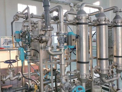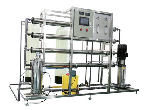 該設(shè)備在預(yù)處理階段采用多介質(zhì)過濾器、活性炭過濾器、鈉離子軟化床去除泥沙、余氯、懸浮物、部分重金屬離子,通過精密過濾器攔截水體中膠體、小顆粒,經(jīng)過反滲透膜(RO膜)去除水體中絕大部分離子,脫鹽率可以達(dá)到98.5%以上,二級反滲透膜再次脫鹽,超純水電導(dǎo)率可以達(dá)到在5μS/cm以下。